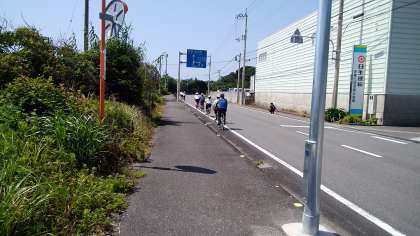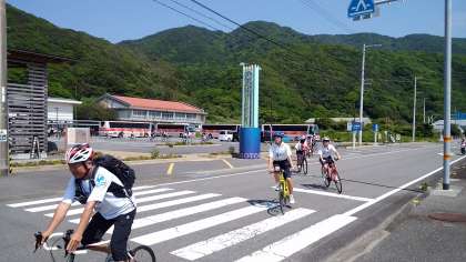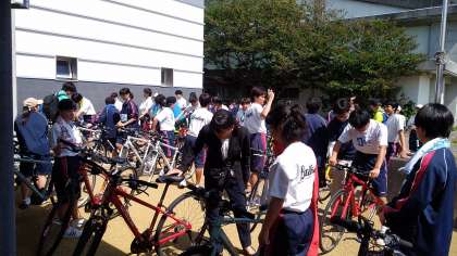 班別活動のサイクリングです。ジオパークセンターから室戸岬までおよそ12?、距離的に梅香中学校から阪急東商店街までの往復くらいだそうです。暑いのでこまめな水分補給で頑張りましょう。安全第一、ヘルメットをつけていってらっしゃーい。