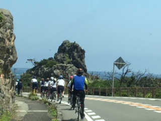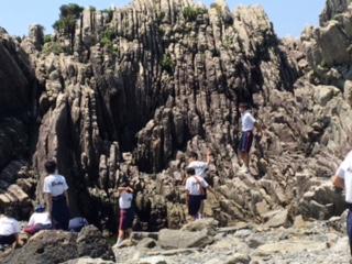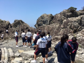 サイクリング体験活動チームが、途中で海岸を散策しています。