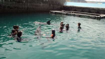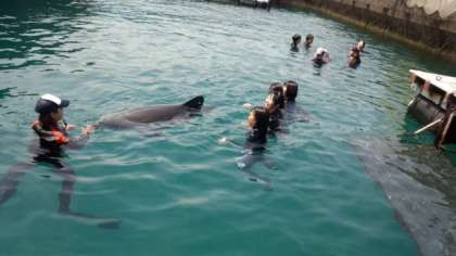 イルカ体験活動グループですが、イルカのプールにいる2頭のイルカがいました。保護したウミガメもいました。これから着替えをして海へ入り、イルカと一緒に遊びます。