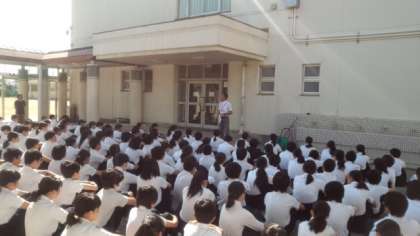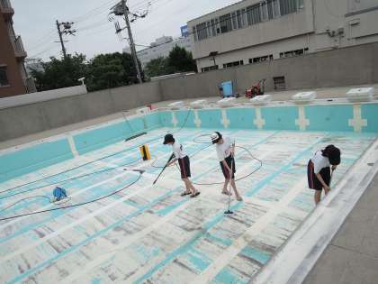 本日、6月13日(木)は定例の2年学年集会でした。先週実施した職場体験学習活動を振り返ったお話が学年の担当の先生や学年主任の先生よりありました。行事をやりっぱなしにするのではなく、そこで学んだことをしっかり生かして自分の将来について考えていってほしいというお話もありました。また、明日は5時限目の特活の時間にお世話になった事業所やお店等への感謝の気持ちを伝えるお礼の手紙を作成していくとのことでした。自分の気持ちを相手に伝える手段の一つ、お礼状の書き方を一人ひとりマスターしましょう。写真は小学校での職場体験でプール清掃をお手伝いしたようすです・・・