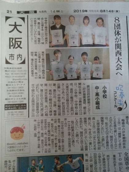本日、8月14日の朝日新聞朝刊に先日開催された第58回大阪府吹奏楽コンクールの記事が掲載されていました。中学校小編成の部で金賞をいただき、その中の4校が関西大会への出場となりました。17日に滋賀県守山市で開催されるコンクールでは、最高のパフォーマンスを期待します。関西大会出場おめでとう。やったね、梅中吹奏楽部の仲間たち。