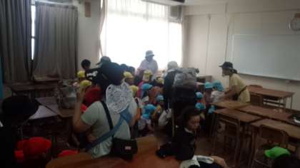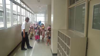 本日、8月22日(木)午前中に地域にある酉島保育所の園児70名が保育園の先生方と一緒に津波を想定した避難訓練のため梅香中学校にやってきました。3歳・4歳・5歳の園児たちが園から10分ほどの道のりを一人ひとり自分の足でがんばって歩いて来て、5階の教室まで階段を上がり一時避難を行い、教室で保護者への引き渡し訓練のシュミレーションを受けていました。みんな静かに先生の指示に従い取り組んでいました。普段からの訓練はとても大切です。暑い中みんなよく頑張りました。