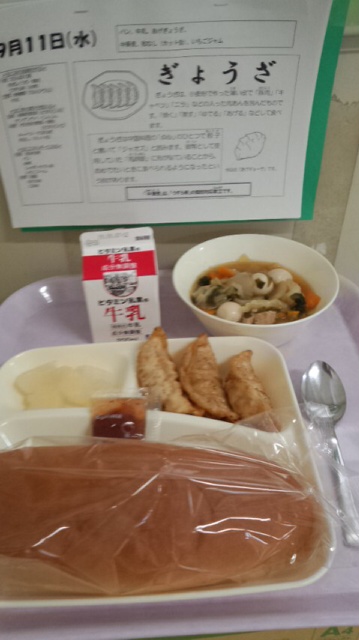 あげぎょうざ 中華煮 和なし いちごジャム パン 牛乳