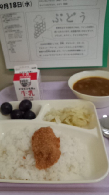 チキンカレーライス 一口ヒレカツ キャベツのピクルス ぶどう 牛乳