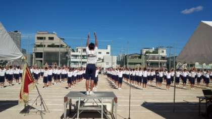 今年の体育大会のスローガンは、「世界一熱い場所、令和に羽ばたけ梅香魂!」