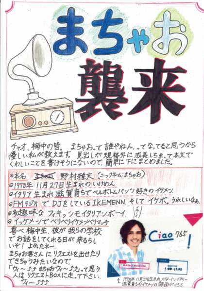 生徒会新聞の特別号でもお知らせをしましたが、FMCOCOLO(ラジオ番組)でDJとしてもご活躍している、「DJまちゃお」こと野村雅夫さんが梅香中学校に来てくれることが決まりました。11月20日(水)のお昼の時間帯ですが、仕事のお話や卒業後の進路に不安がある人、進路に悩める人の相談も聞いてくれるそうです。まずは、どのような放送をラジオで行われているか、17日(木)のお昼の放送でその雰囲気を味わってもらいます。お楽しみに・・・FMCOCOLOで月曜日から木曜日の午前6時から11時にDJをされています。