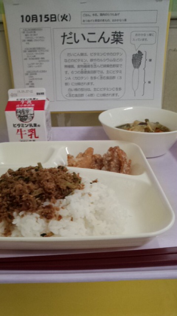 鶏肉のたつたあげ あつあげと野菜の煮もの おかかなっ葉 ごはん 牛乳