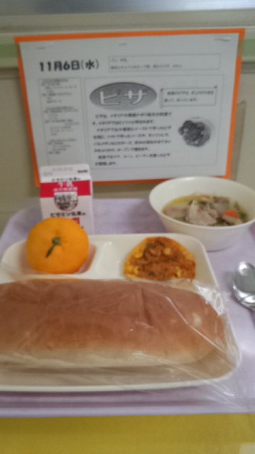 豚肉とキャベツのスープ煮 変わりピザ みかん パン 牛乳