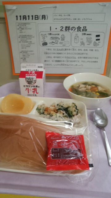 ほうれんそうのグラタン スープ煮 白桃 いちごジャム パン 牛乳