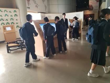 国立民族学博物館での様子です。みんぱくワークシートを一生懸命解いていました。社会科の勉強にもなって一石二鳥ですね。