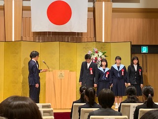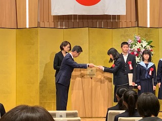 先週の金曜、11月15日に全国納税貯蓄組合連合会および国税庁が募集した「税についての作文」コンクールにおいて本校から3年生の1名がみごと納税貯蓄組合連合会優秀賞の表彰を受けました。JR福島駅前のホテル阪神で行われた表彰式では、他の受賞者とともに表彰状を受け取りました。とても立派でした。この賞が梅香中学校のさらなる発展を予感させる、そんな表彰式でした。本当におめでとうございました。
