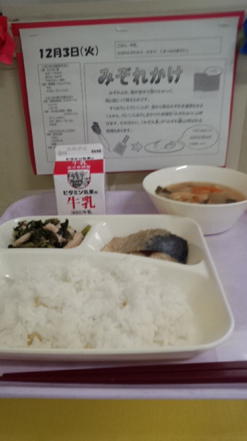 さばのみぞれかけ こまつなの煮びたし ごはん みそ汁 牛乳