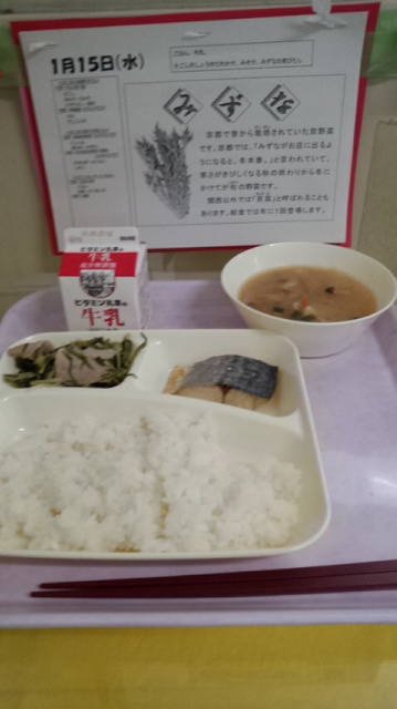 さごしのしょうゆだれかけ みずなの煮びたし みそ汁 ごはん 牛乳