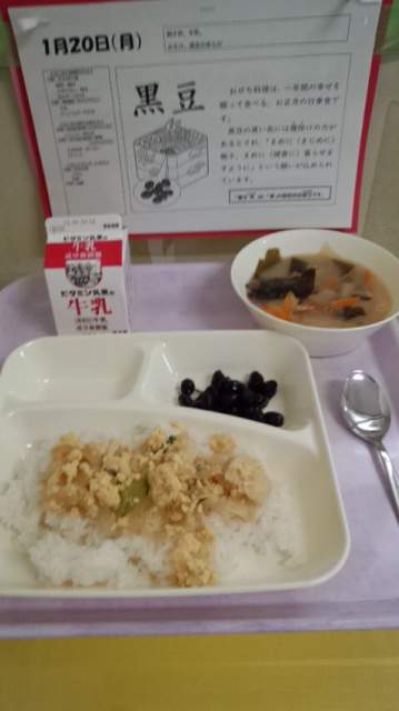 親子丼 黒豆の煮もの みそ汁 牛乳