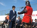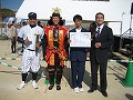 写真はそのときの様子です。大阪の陣400年天下一祭にちなんだ衣装を着た、西原此花区長様より表彰を受けています。