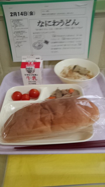 豚肉とごぼうの煮物 なにわうどん プチトマト パン 牛乳