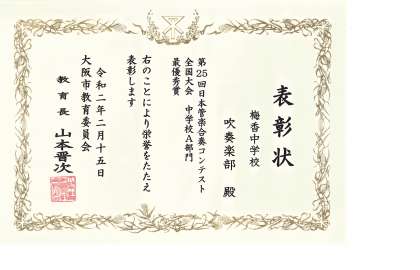 梅香中学校吹奏楽部が第25回日本管楽合奏コンテスト全国大会中学校A部門最優秀賞により栄誉をたたえ教育長表彰に輝きました。 これからも頑張りましょう