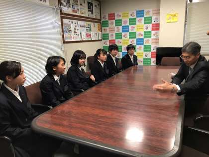 2月18日、生徒会執行役員は此花区役所にて開かれた「区長と語ろう会」に参加してきました。生徒たちは将来の夢や今打ち込んでいることなどについて発表しました。前田区長からは、「人生の選択で、親や友達を責めてもだめ。自分の責任で自分の人生を生きている。」ということや、「『大変だから』というのは諦める理由にはならない。希望や夢を叶えるためには、それを乗り越えるだけの本気をもって取りかかる必要がある。」というような、心に残るお言葉を頂き、生徒たちも熱心にお話を聴いていました。