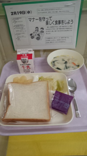 ほうれんそうのクリームシチュー キャベツのサラダ 洋なし ブルーベリージャム パン 牛乳