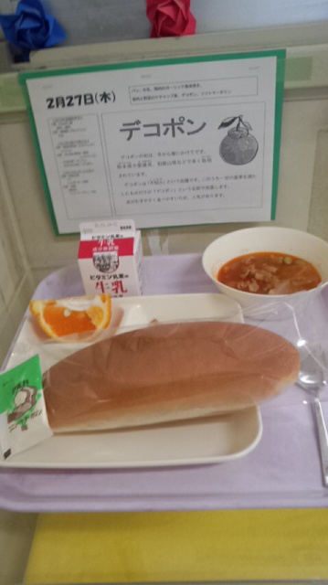 鶏肉のガーリック風味焼き 豚肉と野菜のケチャップ煮 デコポン ソフトマーガリン パン 牛乳