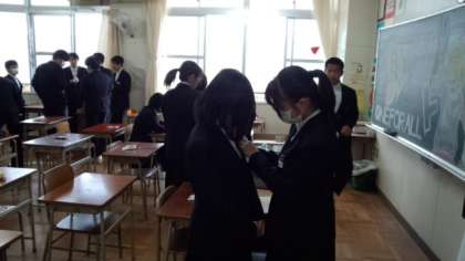 卒業生が登校すると教室で在校生の生徒会役員がコサージュを1人ひとりにつけていました。