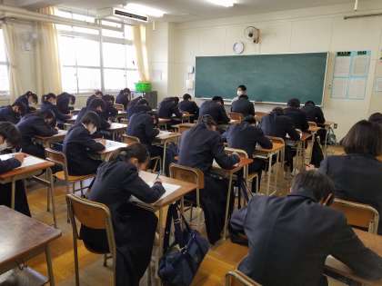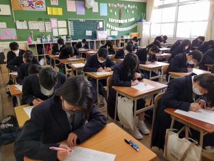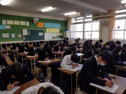 本日5時間目、2年生は冬休みの宿題テスト(英単語100問)を実施しました。13日のチャレンジテストに向けて、しっかり取り込んでいました。間違えた単語はしっかり復習しておきましょう。