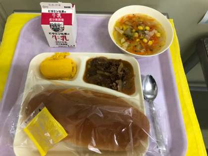 牛肉のデミグラスソース煮、コーンとはくさいのスープ、かぼちゃのプリン