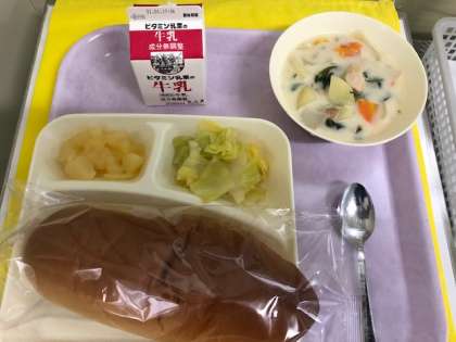 ほうれんそうのクリームシチュー、キャベツのサラダ、洋なし(カット缶)