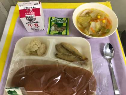 わかさぎフライ、はくさいのスープ、カリフラワーのサラダ、まっ茶大豆