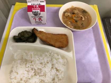 いわしのフライ、みそ汁、きゅうりの赤じそあえ