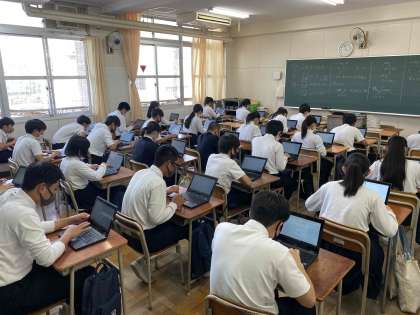 今週1週間、放課後に3年生英語科の補習テストを実施しています。1、2年生の内容で50問、100点満点のテストです。補習1日目は合格点85点、2日目は合格点90点、3日目は合格点95点というように、5点ずつ上がっていく合格点。参加生徒はなんとか1日目で合格しようと頑張っていました。テスト問題は1人1台端末のGoogleフォームに保存されており、生徒たちはそれに答えを入力していきます。答えの入力完了後は「送信」ボタンをタッチするだけで、すぐに点数と間違いの箇所が表示されるので、生徒たちは少し緊張しながらも送信ボタンをタッチ、喜びと悲鳴の声が教室に響きわたっていました。合格した人、英語の土台となるこの内容、何度も解き直して確実に習得しよう!不合格だった人、まだ時間はある!必死に「覚える」のではなく、なぜそうなるのかを理解しよう!理解ができていれば、テスト中にド忘れしても答えを導き出せる!