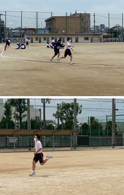 グランドでは、2年1組の体育が行われていて、100m走のタイムを計測していました。