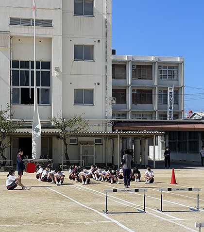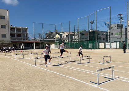 本日、グランドでは、陸上競技のハードル走の授業が行われていました。