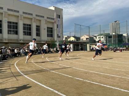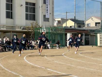 3年生の100メートル走です。皆さん、カーブでは転倒しないよう気をつけてください!