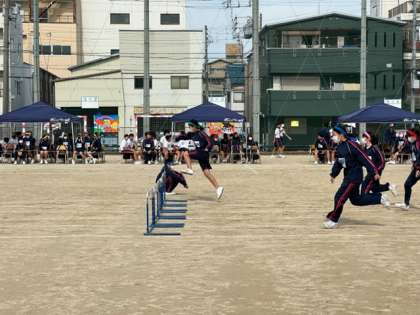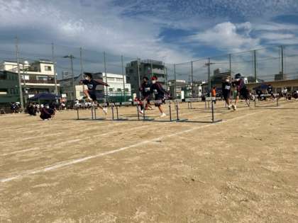 2年生のハードル走です。男子はすごいスピードでハードルを跳んでいきます。