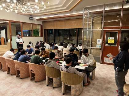 40部屋の室長が1階ロビーに集まり、きょう一日の反省と明日の諸連絡を聞いています。