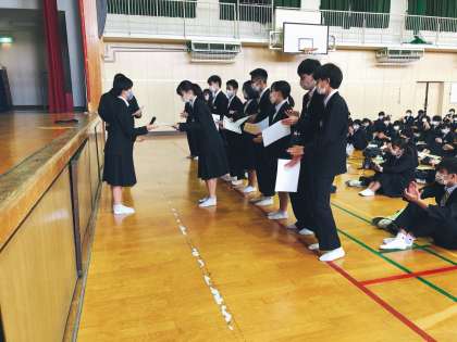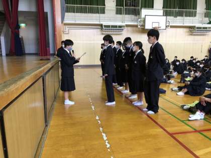今日の3年生は、前日まで修学旅行だったため、3時間目から登校して集会をしました。この修学旅行のまとめ、健康観察、オリエンテーリングの表彰式を行いました。