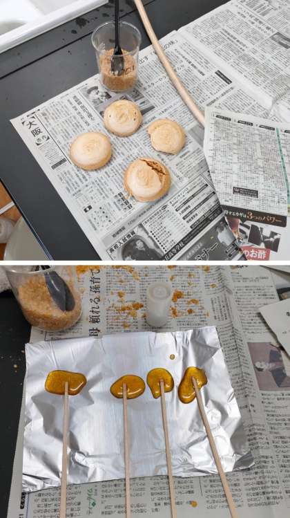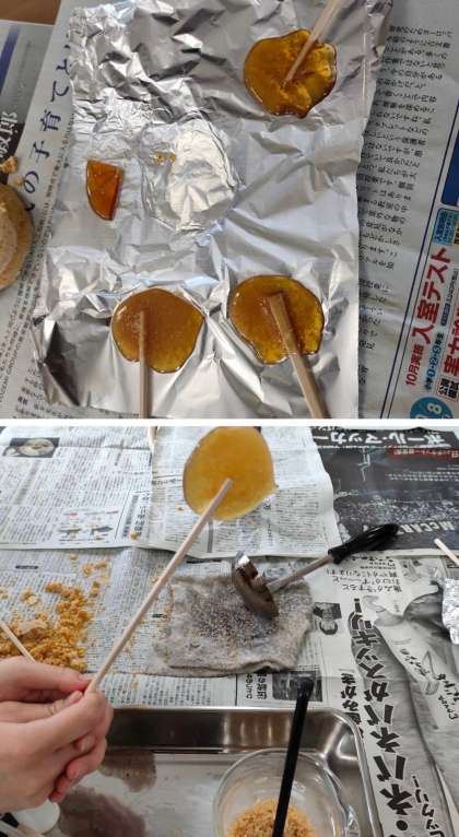3年生の最後の理科実験でカルメラ焼を作りました。おまけでベッコウ飴もできました。