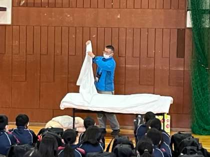 その後は、施設の職員さんからシーツの使い方と布団のたたみ方を教わっています。