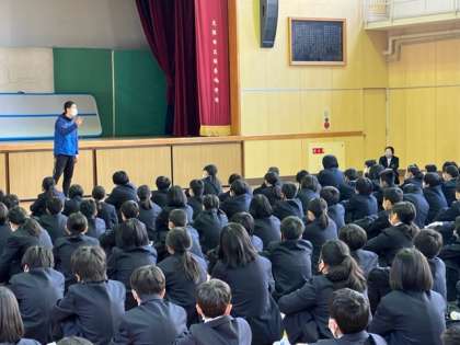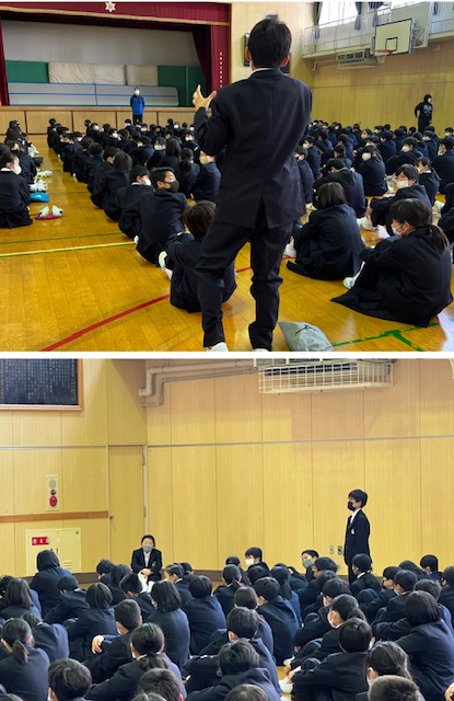 集会では、学年主任の「みなさんは何のために学校へ来ていると思いますか?」との問いかけに、