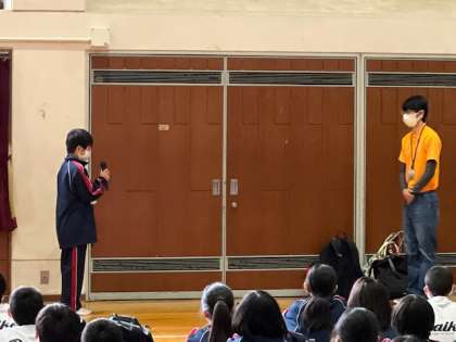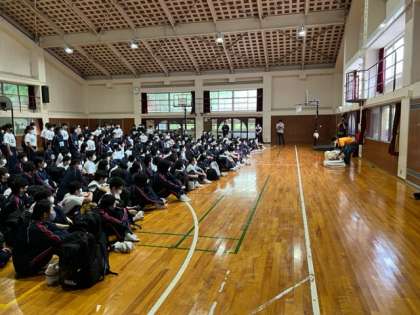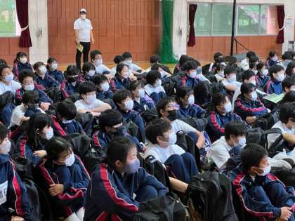 現在、スタッフの方から、布団やシーツのたたみ方等のレクチャーを受けています。みんな真剣な表情で聞いています!