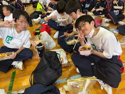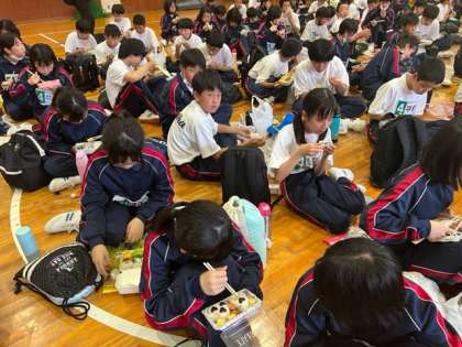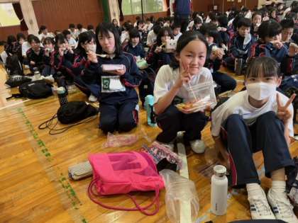 外は晴れていますが、地面が濡れているため、体育館での黙食です!