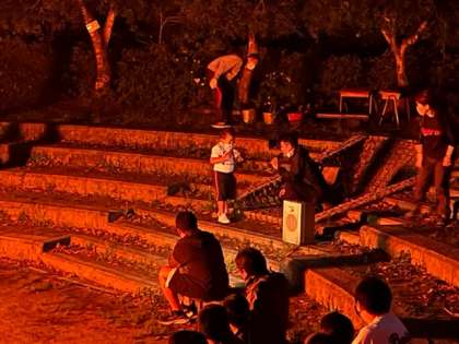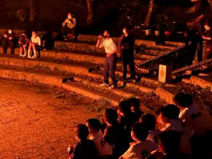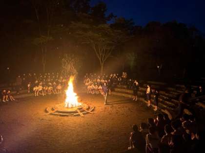 キャンプファイヤーでは、ミルクボーイの漫才や、ブルーハーツの唄、マジックで盛り上がっています。