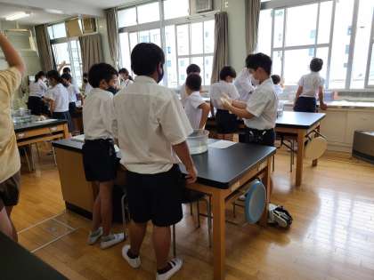 水を入れた空き缶を熱し、急冷する実験を行っています。