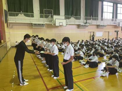 今日の1年生学年集会で、英語100問テストの表彰を行いました。