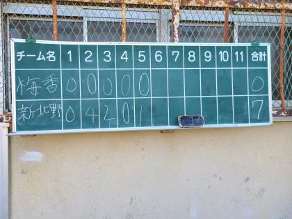 梅香は初回チャンスを作りますが、スクイズ失敗で得点を奪えません。裏を抑えますが、2回以降梅香の悪い部分がでていきます。この試合の得点すべてにエラーや細かいミスがでてしまいます。攻撃面でも新北野のキャッチャーに離塁などを狙われ、ことごとくつぶされます。結局最後もセンターの後逸で5回コールドであっさり負けてしまいました。今日は梅香のいい部分がほとんどでず、悪い部分が目立った試合になりました。これで今年の公式戦は終了です。ただ公式戦で瑞光中や新北野中など大阪市内上位校と試合ができたことは、大きな収穫でした。次の3月の公式戦までに、課題を1つずつ解消して少しでも差をつめたいです。