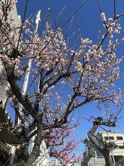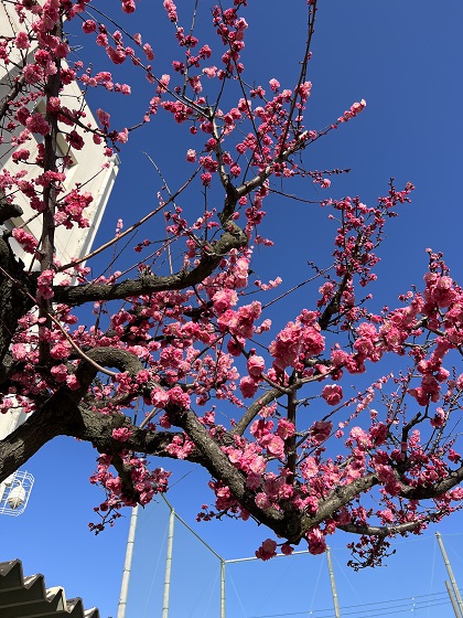 その梅ですが、「のびゆく塔」の両脇に植わっている紅白の梅が、日中のぽかぽかした陽気に誘われ満開を迎えました。