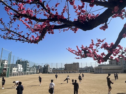 梅の花咲くグランドでは、1年生が保健体育の授業で、ソフトボールを行っています。