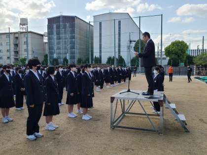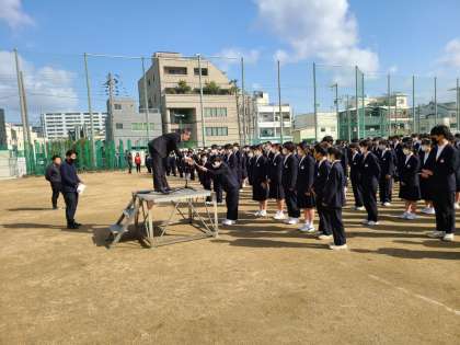 校長先生から役割についての話があった後、今年度前期の生徒会役員や学級委員の認証式がありました。その後バレー部2年生の表彰がありました。