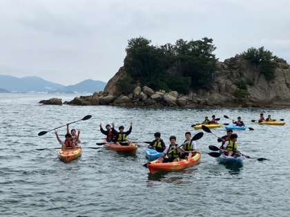 シーカヤック体験。1人乗りと2人乗りのカヤックに分かれて体験しています。